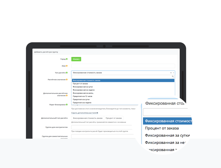 Расчетные группы для водителей. Можно взимать процент от заказа, суточный, недельный план, фиксированную плату за заказ;