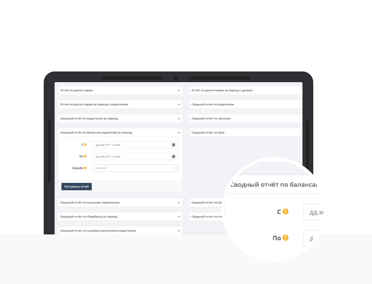 В ПО собрана подробная отчетность для руководителя по заказам такси через программу вашей службы, по сотрудникам и движению средств.